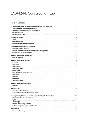 Topics covered: causes and nature of conflicts and disputes; theory of conflict; role of the construction contract; dispute avoidance processes; dispute resolution boards; dispute resolution advisors; novels DAPs; concept and philosophy of Appropriate Dispute Resolution; negotiation; mediation. Notes include