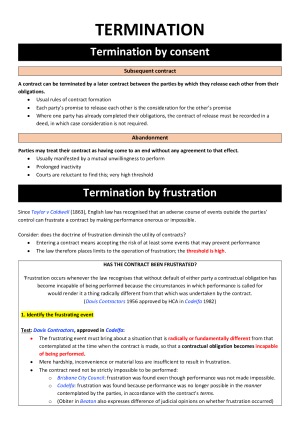 These are the notes that I used in the final exam. Included are: - Hypo structures - Detailed analysis/explanation to aid understanding - Case summaries Topics covered: - Terms (Incorporation, Interpretation, Implication) - Consumer Protection (Unfair Terms, Consumer Guarantees) - Termination (Consent, Frustration, Contingent Conditions, Breach, Restrictions) - Vitiating Factors (Unfair Conduct, Illegality) My notes are typically quite comprehensive but they have served me well so far. In my first year of the JD, I received a scholarship for academic excellence. I have a high H2A average and have done a number of clerkships including one overseas. Next year I will begin working as a graduate at one of these firms.