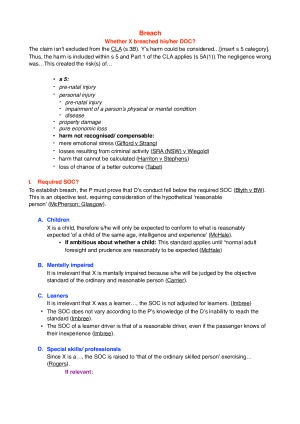 Very comprehensive notes that cover the entire course problem question notes and all essay plans. Topics Breach Causation Defences Recreational activities Vicarious liability Damages Non-delegable duty Statutory duty Key theories Compensatory function of torts, feminism, no fault compensation, reform etc