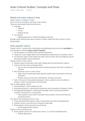 Comprehensive notes for the seminars for Media and Urban Culture for Asia, including the following topics: - pop culture - cultural industries - bollywood - comics - television journalism - independent cinema - new media - architecture - fashion - mobile media These notes would be crucial in the revision process for the final exam, and helped me achieve a score of 94 in the subject!