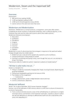 These are my comprehensive notes for Modern and Contemporary Literature. Covering the lecture material under clear headings and dot points. All topics are included: - Modernism - close reading - Dubliners - To the Lighthouse - The Wasteland - essay research - post-war context - Ariel - The Catcher in the Rye - Waiting for Godot - the Contemporary - Brother, I'm Dying - Murakami - The Goat