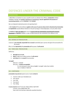 Useful summary for Exam or study of defences available under the Criminal Code. Including: Intoxication Provocation Repetition of insult Self-defense Home invasion Duress Emergency