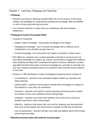 Notes include -Chapter 1 Summary Notes - Learning, pedagogy and teaching -Chapter 2 Summary Notes - How we learn? How students develop and learn -Chapter 3 Summary Notes - Information processing and effective learning -Chapter 5 Summary Notes - Motivation and effective learning: cognitive perspectives -Chapter 6 Summary Notes - Social, emtional and moral development -Chapter 7 Summary Notes - Culture, identity and learning -Chapter 8 Sumamary Notes - Learning environments Also includes: -Key words and definitions -Notes from lectures/tutorial PP A lot of hard work went into these notes so I'd love to sell them to help someone out!
