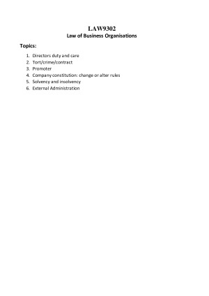 Topics: 1. Directors duty and care 2. Tort/crime/contract 3. Promoter 4. Company constitution: change or alter rules 5. Solvency and insolvency 6. External Administration
