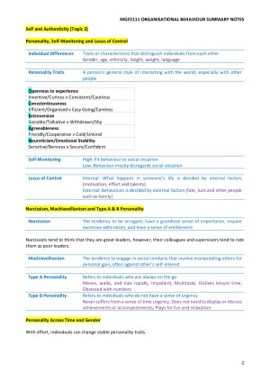 Organised and colour coded notes for MGF2111 (Organisational Behaviour). Include notes from online lectures, readings, tutorials and class discussions. Definitions are outlined in blue font. Examples are outlined in purple font. Topic 1: Introduction to Organisational Behaviour Topic 2: Self and authenticity Topic 3: Emotional intelligence Topic 4: Positive psychology and work satisfaction Topic 5: Judgement and decision-making Topic 6: Will power and work motivation Topic 7: Networking, power and politics Topic 8: Team dynamics and effectiveness Topic 9: Leadership excellence Topic 10: Business ethics Topic 11: Negotiation fundamentals Topic 12: Review