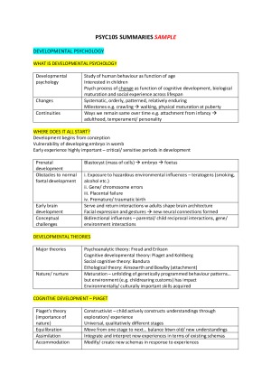 High distinction summary notes covering all examinable: - Lecture topics Topics covered: (1) Developmental Psychology, (2) Health Psychology, (3) Social Psychology, (4) Organisational Psychology, (5) Perception, (6) Cognition - Statistics topics Topics covered: (1) Introduction, (2) Summarising data, (3) Fundamental concepts, (4) T-tests I (5) T-tests I, (6) Correlations, (7) Chi-square tests, (9) Summary