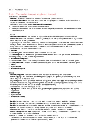 Covers the following topics: 1. The market forces of supply and demand 2. Elasticity 3. Supply, demand and government policies 4. Consumers, producers and the efficiency of markets 5. Application: The costs of taxation 6. Externalities 7. Macroeconomics: income, cost of living 8. Unemployment 9. Inflation 10. Aggregate Demand and Aggregate Supply: 11. The influence of monetary and fiscal policy on aggregate demand 12. The Monetary System 13. Open-economy macroeconomics Also includes all relevant formulas