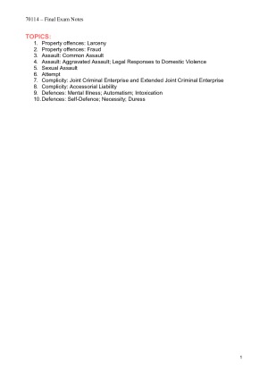 Topics covered: 1. Property offences: Larceny 2. Property offences: Fraud 3. Common Assault 4. Aggravated Assault 5. Sexual Assault 6. Attempt 7. Complicity: Joint Criminal Enterprise and Extended Joint Criminal Enterprise 8. Complicity: Accessorial Liability 9. Defences: Mental Illness; Automatism; Intoxication 10. Defences: Self-Defence; Necessity; Duress
