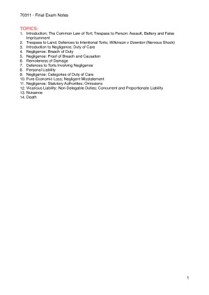 Covers the following topics: Introduction; The Common Law of Tort; Trespass to Person: Assault, Battery and False Imprisonment Trespass to Land; Defences to Intentional Torts; Wilkinson v Downton (Nervous Shock) Introduction to Negligence; Duty of Care Negligence: Breach of Duty Negligence: Proof of Breach and Causation Remoteness of Damage Defences to Torts Involving Negligence Personal Liability Negligence: Categories of Duty of Care Pure Economic Loss; Negligent Misstatement Negligence: Statutory Authorities; Omissions Vicarious Liability; Non-Delegable Duties; Concurrent and Proportionate Liability Nuisance Death