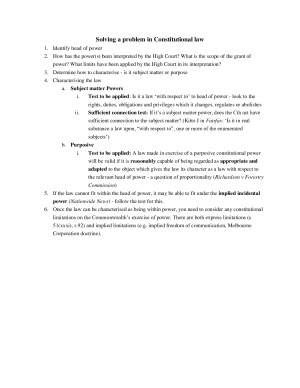 Comprehensive textbook/lecture/exam notes covering all topics + how to answer problems. Includes: Solving a Problem in Constitutional Law (Scaffold) Judicial Power Race Power (s 51xxvi) Implied Freedom of Political Communication Characterisation Trade and Commerce Power Executive Power: Ch II, s 61 - 63 (prerogative power of the Crown, nationhood power, power to enter into contracts and spend money) External Affairs (s 51(xxix)) Aliens Power Acquisition on Just Terms Section 109: Inconsistency Section 80: Trial by Jury Section 116: Freedom of Religion