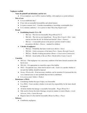 Perfect comprehensive textbook/lecture/exam notes for assignments and exam. Also includes a problem question scaffold. Includes: Negligence (Scaffold) The Common Law of Tort Trespass to Land, Defence to Intentional Torts and Wilkinson v Downton Negligence: Duty of Care and Role in Public Policy Legal Ethics: Advocates’ Immunity, Lawyers and Negligence: The Duty to the Client Negligence I: Breach of Duty of Care Negligence II: Proof of Breach and Causation Negligence III: Scope of Liability Negligence IV: Defences to Negligence Negligence V: Categories of Duty of Care Negligence VI: Pure Economic Loss Negligence VII: Statutory Authorities Negligence VIII: Strict Liability, Multiple Defendants Self-Learning Module 1: Nuisance Self-Learning Module 2: Death