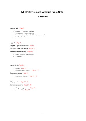 Received 54/60 on the exam receiving an 88 overall Includes all topics except for Bail which was not examinable Topics 1 Overview of the Crim Justice System (Corresponds to "General Info", "appeals', 'right to legal representation' and 'evidence' - see contents page 2 Commencement of criminal proceedings ( Corresponds to commencing proceedings) - see contents page - notice to appear and summons, time limits 3 Search and Seizure ( corresponds to 'arrest' and 'search and seizure' 4 Fingerprinting and Forensic Procedures 5 Police Questioning 6 Bail - NOT INCLUDED 7 ID evidence 8 Trial of Indictable offences 8 Machinery of the prosecution - including plea, duties and sentencing 9 Trial of indictable offences - covered on page 48 -49 under machinery of the prosecution and under 'other procedures' - see contents page 10 Pre- Trial Procedures - corresponds to 'Other procedures' - pre-trial processes (committal process, changing pleas etc) - see contents page 11 Jury - corresponds to 'Jury process'