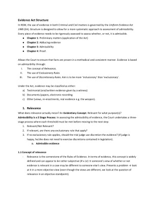 Comprehensive complete textbook/lecture/exam notes covering all topics. Useful for class participation and the final exam. Includes: Relevance Concept of Privilege Documentary Evidence, Real Evidence How Witnesses are Examined Credibility Rule Hearsay Evidence Section 60 Provisions, Admissions Opinion Evidence Tendency and Coincidence Evidence Rationale between Discretionary Rules, Mandatory Rules Warnings and Directions