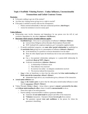 Extremely concise scaffolds used for the final exam preparation. Updated to include new topics (trespass, nuisance, Topics covered include: Topic 4: Undue influence, Unconscionable transactions & Unfair contract terms Topic 5: Duress & Mistake Topic 6: Misrepresentation at Common Law & Statutory liability for misleading or deceptive conduct Topic 7: Trespass to land Topic 8: Private nuisance Topic 9: Tort liability for interference with goods Topic 10: Intentional economic torts Topic 11: Purely economic loss - negligent misstatements & professional negligence Topic 12: Purely economic loss - damage to third party property or injury to a third party Topic 13: Purely economic loss - defective structures and products Topic 14: Multiple wrongdoers - proportionate liability