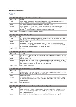 Included is a breakdown of every case mentioned in the lectures that is examinable in the exam. I broke it down by: - Area Of Law - Issue - Facts - Decision - Legal Principle It is neatly formatted and includes page references for the current textbook.