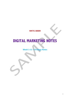 This is the complete set of notes I've made and compiled specifically for the exam last year. Hence, it contains all the relevant information needed to be reviewed either before or after lectures and also for the exam. The contents of this file include: Week 1 - Introduction Week 2 - Strategy Week 3 - Web Analytics Week 4 - SEO Week 5 - SEM (Pay Per Click) Week 6 - Web Design & UX Week 7-8 - Viral Marketing & eWOM Week 10 - Social Media Week 11 - Email & Mobile Virology Notes  I've summarised and re-written most of the contents for all the 11 weeks of lectures to make it more comprehensible. I've also included summarised notes from the Virology series that the lecturer had decided to be examinable last year. They are great supplementary information that could be used to make your exam answers achieve full marks. This note is also formatted in a way that is easier on the eyes (hint: it's not just a wall of text) with bullet points, coloured text, and bold text. According to my tutor, topics highlighted in red and/or with exclamation marks (in the note) are frequent questions asked in the exam. While this file should cover most, if not all, of the theory part of the subject, please do still go over examples (such as the practices on lectures), tutorials, and sample exams if available to help in your studies. This note should just be considered as a revision or a reminder of the most important parts of the subject. I especially suggest you to revise illustrations/graphs/pictures from the lectures as the lecturer may include a question that came from an obscure concept from a single slide throughout the whole semester. Well that's all from me, best of luck with your studies! Hope you all get H1s with the help of my notes :)