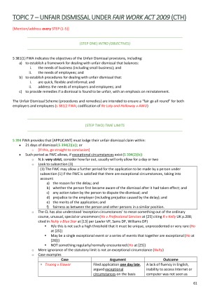 Tailored for exams by compiling all notes from the semester into one document, including from lectures, readings throughout semester and cases. You could use this without doing any other research. Includes sentences to be copied out in the exam and altered depending on facts, as well as application of different scenarios using relevant cases and relevant legislation. Judges cited throughout to make authority used even more precise. INDEX Topic 1 - Employees v Independent Contractors + The Context and Nature of Working Arrangements Topic 2, 3 + 4 - Formation of the Employment Contract Topic 5 + 6 - Implied Duties in Employment Contracts Topic 7 - Unfair Dismissal under FWA 2009 Topic 8 - Termination + Remedies (CL) Topic 9 - General Protections (Adverse Action) in FWA Topic 10 - Anti-Discrimination and Bullying Protections - Workplace Dismissal + Injunction Claims