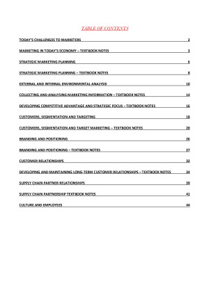 These are well-condensed but detailed notes on each topic to help prepare for final exams and complement your study for Marketing Planning and Strategy at University of Technology Sydney. The following notes contain diagrams and information to help clearly understand Marketing Planning and Strategy and includes notes from all lectures, tutorials and THE TEXTBOOK. Specifically, the following topics are covered for lectures: 1) Today's Challenges to Marketers 2) Strategic Marketing Planning 3) External and Internal Environment Analysis 4) External and Internal Environment Analysis 5) Customers, Segmentation and Targeting 6) Branding and Positioning 7) Customer Relationships 8) Supply Chain Partner Relationships 9) Cultures and Employees 10) Course Overview - NOT INCLUDED 11) No Lecture 12) No Lecture Good luck and thank you for using those notes. Note: The sample notes contain 10% of the complete notes.