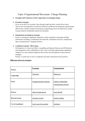 Notes that I used for my exam and general study. 1. Change / Intervention Sequence 2. Intervention 3. Needs for change and Diagnosis 4. Change Strategy and planning 5. Implementation 6. Sustain changes 7. Leading changes 8. Stakeholder Management 9. Communication for change 10. Resistance Reduction