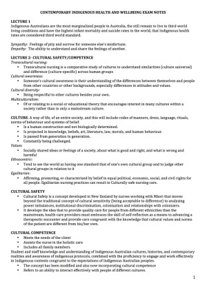 Notes for subject 92317 Contemporary Indigenous Health and Wellbeing- received a 75 (distinction) using these notes and revision questions.