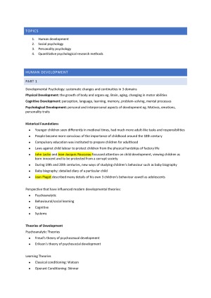 Summary of the lectures + all the statistical modules. Topics included: Human Development Social Psychology Personality Psychology Quantitative Psychological Research Methods