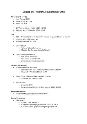 All the lecture notes typed up. Module 1 – Torrens: Boundaries of Land Module 2 – Torrens: Indefeasible Title by Registration Module 3 – Torrens: Quality of Title by Registration Module 4 – Torrens: Leases Module 5 – Torrens: Three Non-Possessory Interests Module 6 – Torrens: Mortgages and Co-Ownership Module 7 – Trusts: Nature and Classification Module 8 – Trusts: Creation of Express Trusts Module 9 – Trusts: Non Express Trusts Module 10 – Trusts: Trustees Module 11 – Trusts: Trustee Rights and Remedies Module 12 – Trusts: Trust Remedies and Defences