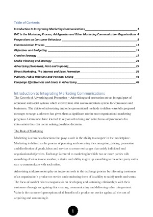 These are well-condensed but detailed notes on each topic to help prepare for final exams and complement your study for Integrated Marketing Communications at University of Technology Sydney. The following notes contain diagrams and information to help clearly understand Integrated Marketing Communications and includes notes from all lectures, tutorials and THE TEXTBOOK. Specifically, the following topics are covered for lectures: 1) Introduction to Integrated Marketing Communications 2) IMC in the Marketing Process; Ad Agencies and Other Marketing Communication Organisations 3) Perpsectives on Consumer Behaviour 4) Communication Process 5) Objectives and Budgeting 6) Creative Strategy 7) Media Planning and Strategy 8) Advertising (Broadcast, Print and Media) 9) Direct Marketing, the Internet and Sales Promotion 10) Public Relations, Publicity and Personal Selling 11) Campaign Effectiveness and Issues in Advertising 12) Revision Lecture - Not Included Good luck and thank you for using those notes. Note: The sample notes contain 10% of the complete notes.
