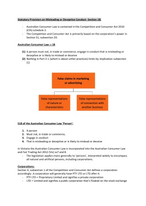These notes include: -The elements of Defamation -Defences to Defamation and Damages -Misleading information Torts -Statutory Provision on Misleading or Deceptive Conduct- Section 18 -False claims in advertising -Common law and Statutory passing off -Specific prohibitions on false or misleading representations (Part 3-1 of the ACL) -Liability of manufacturers for defective goods (Part 3-5) -Economic Torts (Recovery in negligence for acts causing pure economic loss, Tort of interference with contractual relations, Tort of intimidation and Tort of conspiracy) These are detailed notes which can be used for assignments and the exam. Summaries can be drawn from them for the exam if you struggle with time.
