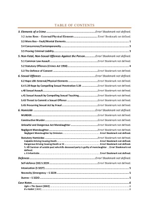 Succinct summary of the whole semester and all that you will need to get a HD in the exam. The notes also include a detailed summary of each important case mentioned in the lectures/reading guide, categorised for each topic. The topics includes: - Elements of a crime - Non-fatal, non-sexual offences against the person - Sexual offences - Homicide - Defences - Case notes