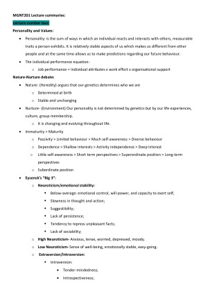 - Nature v Nurture Debate - Eysensk’s “Big 3” - The Big 5 - Culture - Emotions and moods - Perception and Decision Making - Attribution Theory - Bounded rationality - Common biases - Groups/Teams - Leadership - Communication & Interpersonal Skills - Motivating Employees - Power and Politics - Change Management - Learning and job satisfaction