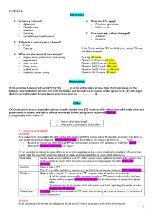 Notes and set out exam stucture. Topics include: Termination for Breach Repudiation Termination for Delay Consequences of Affirmation or Termination Restrictions on the Right to Terminate Damages Liquidated Damages and Penalties Specific Performance Injunctions Restitution Actions for Debt Frustration Duress Undue Influence Unconscionable Conduct Impropriety by Third Parties Rescission Unconscionable Conduct Under Statute Misleading and Deceptive Conduct Remedies for MDC and Statutory Unconscionability