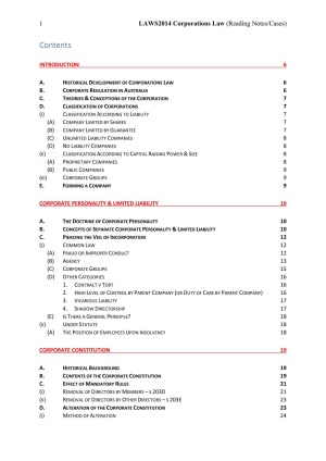 Covers the entire course and provides useful case and legislation summaries that are especially helpful for exam preparation. Topics covered include: - Corporate Personality & Limited Liability - Corporate Constitutions - Corporate Organs - Corporate Capacity, Authority and Breach of Duty - Directors' Duties - Members Rights & Remedies My notes are colour-coded as follows: YELLOW = Cases GREEN = Legislation