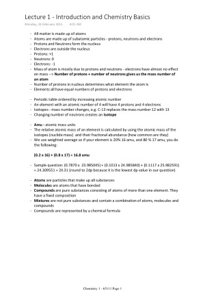 Chemistry 1 Lecture Notes summarized in easy to understand dot points and diagrams, with sample questions for further understanding of concepts. Relevant diagrams and colloquial notes add quality to the notes.