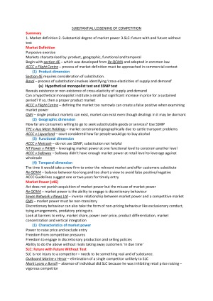 Short summary that was permitted in the exam. Topic included: - substantial lessening of competition - cartels - misuse of market power - exclusive dealing - resale price maintenance - mergers and acquisitions