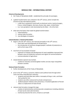 All of the lecture notes summarised per module. (In the notes context, module refers to the week) Module 1 – International History Module 2 – Theories of International Relations Module 3 – Actors in World Politics: States and Individuals Module 4 – Actors in World Politics: Governments, Non-State Actors and Foreign Policy Module 5 – Interdependence and Conflict Module 6 – International Law and International Regimes Module 7 – Evolution of Australia's Political Culture Module 8 – Australia as a Middle Power and Security Challenges Module 9 – Global and Human Security: Military Power and National Security Module 10 – Global and Human Security: Human Security and Human Rights Module 11 – Gender Issues and Cultural Differences Module 12 – The International Political Economy