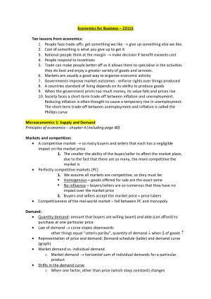 easy to understand, to the point notes, but with enough information to get a good mark in the quizzes and final exam. covers all topics: - supply and demand - equilibrium and elasticity - government policies - efficiency of markets - cost of taxation - externalities - macroeconomics - aggregate demand and supply - monetary policy and fiscal policy - external sector / balance of payments / exchange rates