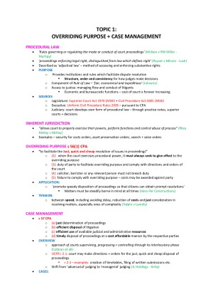 straight forward, comprehensive civil notes. great for class participation, the essay and exam. colour coordinated + organised - makes them very easy to use in the final exam. covers all topics: -overriding purpose and case management - access to justice, open justice, pre-litigation, client care - ADR - initiating proceedings and commencing litigation - evidence in proceedings + discovery - interlocutory applications and injunctions - costs as a means of managing litigation + cost orders strike out, summary dismissal, vexatious litigants - judgement enforcements and appeals