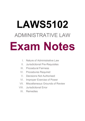 Detailed exam notes for Administrative Law. Structured to answer problem questions and essays. Includes both the ADJR and case law. Covers the content from lectures and tutorials, and includes case summaries and relevant statutory provisions. Print ready. Topics covered: 1. Nature of Administrative Law 2. Jurisdictional Pre-Requisites 3. Procedural Fairness 4. Procedures Required 5. Decisions Not Authorised 6. Improper Exercise of Power 7. Miscellaneous Grounds of Review 9. Remedies