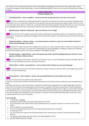 Comprehensive equity notes. Includes opening sentences (OS), step by step to answer exam questions, brief summary of concepts to jog your memory, case summaries. Topics covered include: - Fiduciary relationships and duties - third party liability - breach of confidence - personal remedies - proprietary remedies - equitable assignments