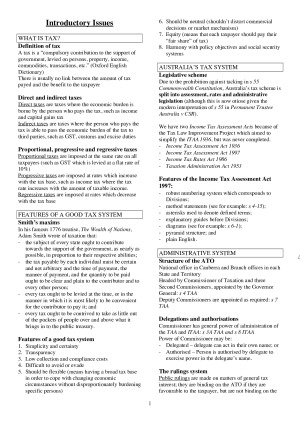 Comprehensive Tax Law Exam Notes Easy to read and navigate in exam conditions Achieved a mark of 7 on the final exam, using these exact notes Includes: Full case summaries for all prescribed and recommended cases All relevant information from prescribed readings Content: Introduction and Assessment Residency and Source Income Deductions CGT Superannuation FBT Taxation of Partnerships and Trusts Taxation of Companies GST Anti-Avoidance
