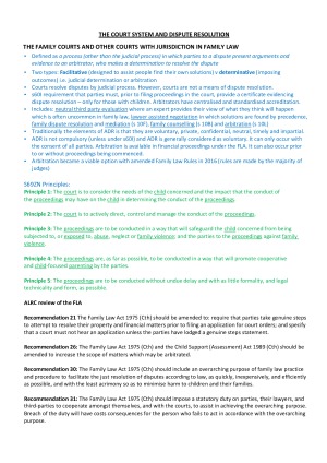 Notes for all topics of the Semester including: The Court System & Dispute Resolution Marriage, Divorce & Other Relationships Family Violence Parenting (Relocation, Wishes of the Child etc) Child Support and Maintenance Property Division (almost 30 pages) These notes are comprised of lecture notes, personal notes, commentary from cases, case notes, notes from the textbook and extracts of relevant legislation - all colour coded.