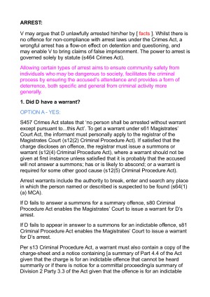 This is a comprehensive exam script that can be written out in the exam, including a rationale for the law, explanation of the rule, case analogies and potential arguments that can be raised. It covers topics including arrests, custody, bail, mental impairment defences, strict and absolute liability, drug offences, property offences, inchoate offences and corporate criminal liability.