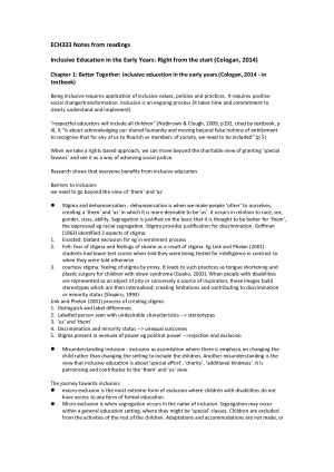 Covers the following readings - Chapter 1: Better Together: inclusive education in the early years (Cologan, 2014 - in textbook) - Chapter 2: Ableism, disablism and the early years (Cologon & Thomas, 2014 - in textbook) - Chapter 3: More than a label? The power of language (Cologon, 2014 - in textbook) - Chapter 5: “Not just being accepted, but embraced”: Family perspectives on inclusion (Cologon, 2014, - in textbook) - Chapter 9: Family- centred practice for inclusive early years education (Fordham & Johnston, 2014) - Chapter 23: Inclusion of Children through Augmentative and Alternative Communication Supports (Teresa Iacono & Kathy Cologon) - Implementing the Three Block Model of Universal Design for Learning: effects on teachers’ self efficacy, stress and job satisfaction in inclusive classrooms K-12 (Jennifer Katz) - Chapter 7: gender matters in the early years classroom (Smith, Alexander & Juma) - Neurodiversity: An insider perspective (Jacquiline den Houting, 2018) - Lalvani, P., & Broderick, A. A. (2013). Institutionalized ableism and the misguided “Disability Awareness Day”: Transformative pedagogies for teacher education. Equity & Excellence in Education, 46(4), 468-483. - Adomat, D. S. (2014). Exploring issues of disability in children’s literature discussions. Disability Studies Quarterly, 34(3), doi: - Chapter 17: Play and inclusion - Chapter 10: inter-professional practice to support inclusion (Wong, 2014) - Biklen, D., & Burke, J. (2006). Presuming Competence. Equity & Excellence in Education, 39(2), 166-175. doi: - Chapter 8 in the textbook: Atkinson, S., & Srinivasan, P. (2014). The possum hunt: A ghost story for pre-schoolers? Death, continuity and the revival of aboriginality in Melbourne. In K. Cologon (Ed). Inclusive education in the early years: Right from the start (pp. 152-168).South Melbourne: Oxford University Press - Chapter 26 in the textbook: Cologon, K. (2014). Constructing inclusion: putting theory into practice. In K. Cologon (Ed). Inclusive education in the early years: Right from the start (pp. 521-539).South Melbourne: Oxford University Press
