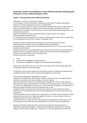 The following readings are covered in these notes: Required textbook: Leadership: contexts and complexities in early childhood education (Waniganayake, Cheeseman, Fenech, Hadley & Shepherd, 2017) Chapter 1 (textbook): Conceptualising early childhood leadership Chapter 2: The Australian policy context Chapter 6: Pedagogical leadership Chapter 3: Leading for quality Chapter 13: Money Matters Sinclair, A. (2007). Leadership for the disillusioned. Moving beyond myths and heroes to leading that liberates. Crows Nest NSW: Allen and Unwin. Siraj-Blatchford, I. & and Manni, l. (2006). Effective leadership in the early years sector: The ELEYS study. London: Institute of Education, University of London. (available via iLearn) Cheeseman, S. (2007). Pedagogical silences in Australian early childhood social policy. Contemporary Issues in Early Childhood, 8 (3), 244-254. Making a space for pedagogy: The story about Mia Mia - a work in progress Hughes, P., & MacNaughton, G. (1999). Communication in early childhood services. A practical guide. Melbourne: RMIT Publishing. (Part 2: Communication, 40-91) Australian Children’s Education and Care Quality Authority. (ACECQA). (2011). Guide to developing a quality improvement plan. Rodd,J.(2013).Leadership in early childhood. The pathway to professionalism. (Chapter10). Crows Nest, NSW: Allen and Unwin. Whalley, M. (2001). Working as a team. In (Ed.). Contemporary issues in early childhood. Working collaboratively for children. London: Sage Textbook Chapter 10 “Creating a Community of Learners” Textbook Chapter 5 “Strategic Planning and Social Entrepreneurship” Textbook Chapter 11: Relationships with families Arnold, C. (2007). Persistence pays off: Working with parents who find our services ‘hard to reach’. In M. Whalley, M. & the Pen Green Centre Team, Involving parents in children’s learning (pp86-104). London: Sage. Textbook Chapter 15: Career development and succession planning Caldwell, B. (2008). From workforce to talent force. Independence,33(1),30-33.