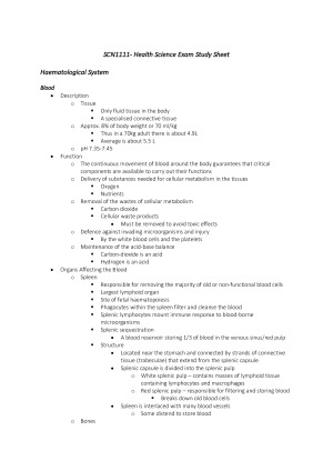 The study sheet covers all lectures and a summary of Understanding pathophysiology readings. Topics include: -Haematological system -Musculoskeletal system -Endocrine system -Neurological System