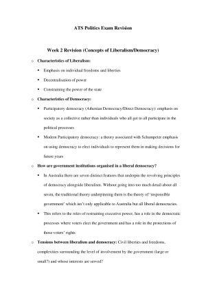 Notes cover content from weeks 2-11 (from the lectures, readings as well as discussion notes from tutorials) Topics are: Concepts of Liberalism/Democracy ‘Constitutionalism’ and the Westminster System in Australia Australia’s system of governance and the Australian Constitution 1975 Australian Constitutional Crisis Australian Public Service Electoral systems and electoral behavioral patterns Australian Labor Party Australian Liberal/National parties and the existence of the Coalition Minor Parties in Australia