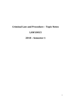 Topics: - INTRODUCTION AND FOUNDATIONS OF CRIMINAL LAW – WEEK 1 - HOMICIDE: MURDER – WEEK 2 - HOMICIDE: VOLUNTARY AND INVOLUNTARY MANSLAUGHTER – WEEK 3 - SEXUAL OFFENCES – WEEK 4 - ATTEMPTS – WEEK 4 - PROPERTY OFFENCES: THEFT – WEEK 5 - PROPERTY OFFENCES: FRAUD/DECEPTION OFFENCES & BURGLARY – WEEK 6 - PROPERTY OFFENCES: ROBBERY – WEEK 7 - DEFENCES – WEEK 8 - ASSAULT – WEEK 9 - BAIL – WEEK 9 - CRIMINAL PROCEDURE – WEEK 10 - CRIMINAL PROCEDURE CONTINUED – WEEK 11 Books: Arenson, Kenneth J and Mirko Bagaric, Criminal Processes and Investigative Procedures - Victoria and Commonwealth, (Lexis Nexis Butterworks, 3rd ed, 2015) Arenson, Kenneth J, Mirko Bagaric and Peter Gillies, Australian Criminal Law in the Common Law Jurisdictions, (Oxford University Press, 4th ed, 2016) Lectures: 11