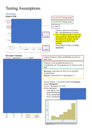 Includes: - What the assumption is & what it's testing - Stata Syntax - Examples of Stata output - How to interpret Stata output FOR: - Descriptive Statistics - Normality (Shapiro Wilk) - Homogeneity of Variance/Homoscedasticity (Levene's Test)