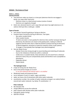 This document contains all content covered in HSN104 during weeks 1-11. It has been typed in an easily understandable and simplified way. Content has been categorised weekly for your convenience, allowing you to see the theory in perspective. These notes also help simplify the complex chemistry theories often used in this subject. Specific topics covered in this document include: - Water - Protein - Lipids - Carbohydrates - Food safety - Quality Assurance and HACCP - Food preservation - Product development This difficult subject is made easier through the use of tables, diagrams, mnemonics and examples.