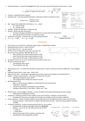 A succinct overview of the entire course. Includes all exam relevant information, includes key definitions and easy to follow explanations. Topic list: - Experimental design - Data and graphical studies - Numerical summaries - Normal model - Linear model - Understanding chance - Chance variability - Sample surveys - Hypothesis testing - Tests for a mean - Tests for a relationship